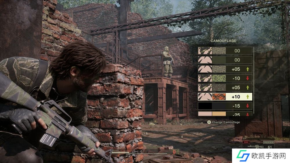 此外,还有极为复杂的伪装指数系统 (Camouflage Index System)。不同的制服、脸部彩绘和伪装都能提高 Snake 在任务期间不被发现的可能性,但随着视觉技术的进步,这套机制被提升到全新的层次。在泥土和泥巴里打磙,Snake 能巧妙地伪装在环境里,进而提升他的迷彩指数。