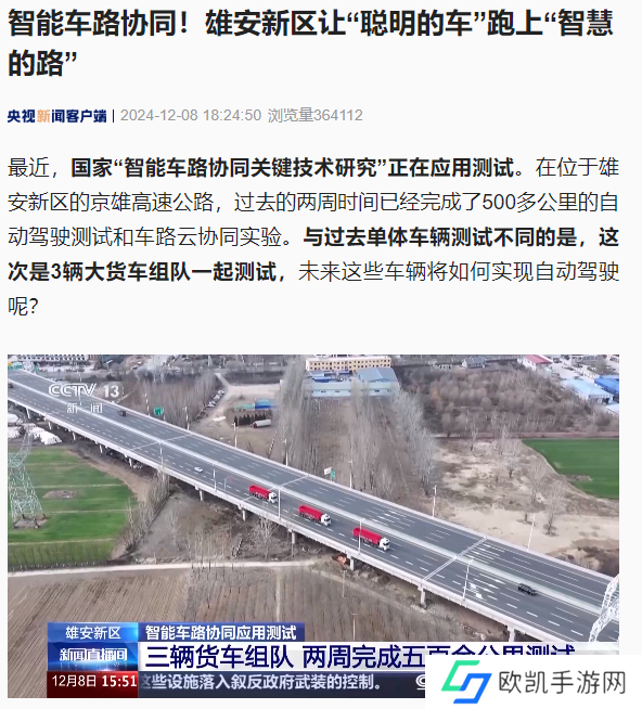 本站 12 月 8 日消息,据央视新闻报道,最近,国家“智能车路协同关键技术研究”正在应用测试。在位于雄安新区的京雄高速公路,过去的两周时间已经完成了 500 多公里的自动驾驶测试和车路云协同实验。与过去单体车辆测试不同的是,这次是 3 辆大货车组队一起测试。