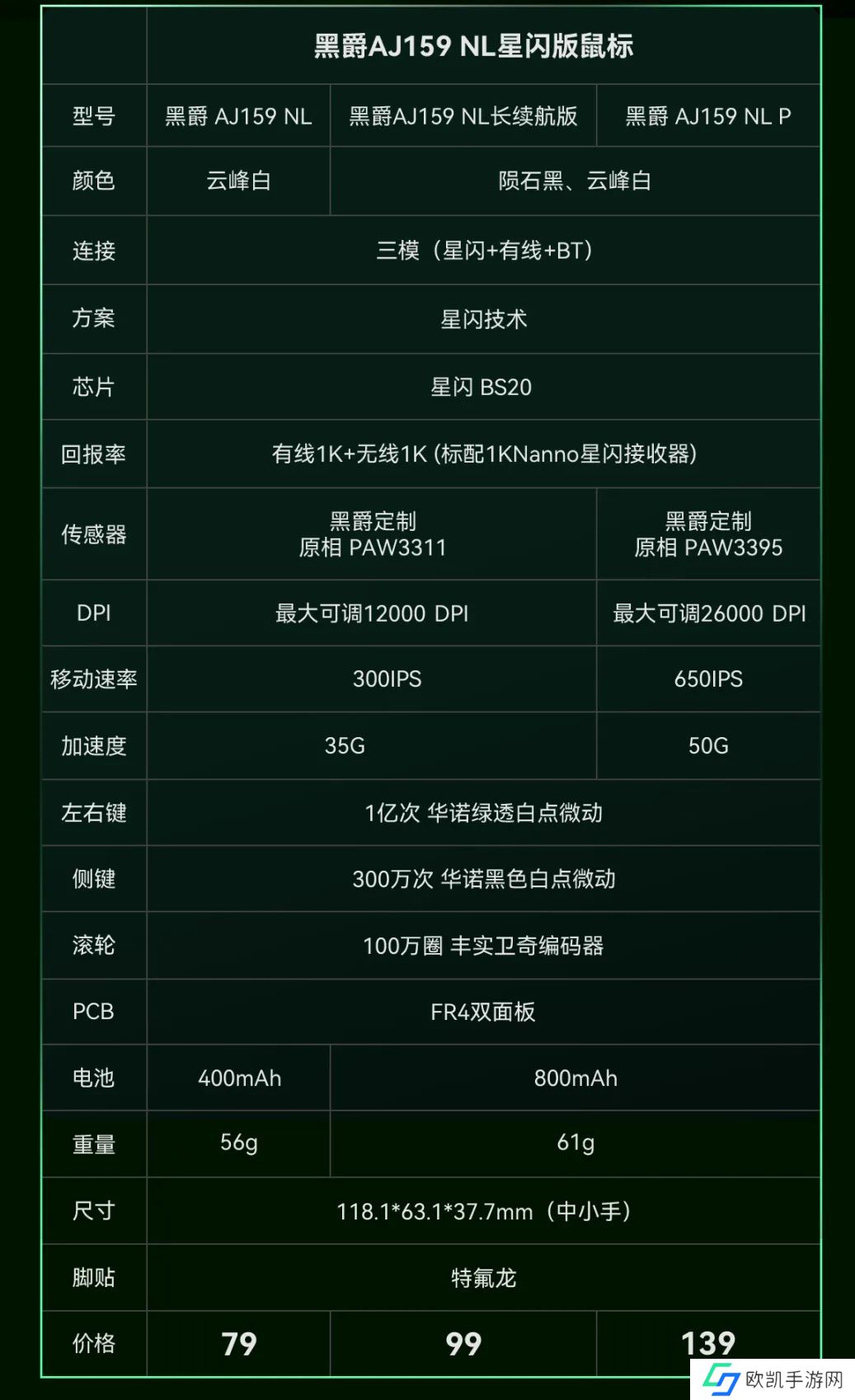 本站附黑爵 AJ159 NL 系列星闪鼠标产品参数对比如下: