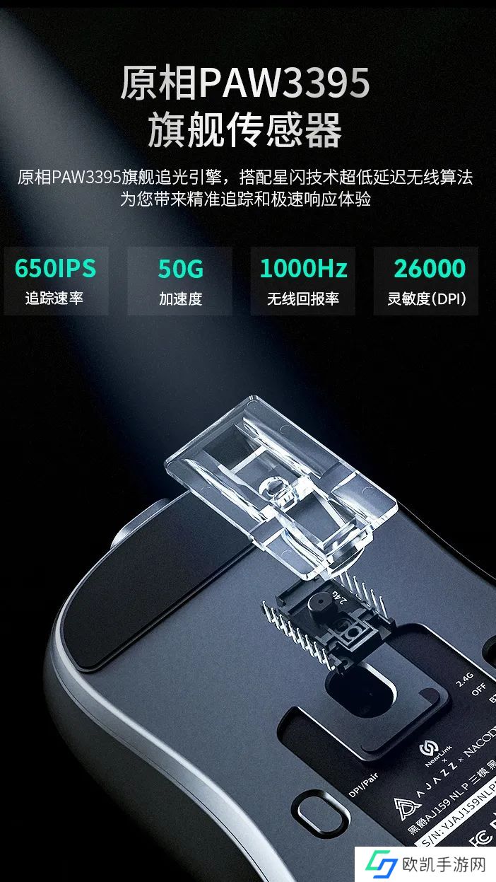 黑爵 AJ159 NL P 高配版鼠标搭载原相 PAW3395 传感器(其他版本为 PAW3311),支持 100-26000DPI 可调、650IPS 追踪速率、50G 加速度。黑爵 AJ159 NL 全系左右按键采用华诺绿透白点微动开关(1 亿次点击寿命)、滚轮为丰实卫奇编码器(100 万圈)。