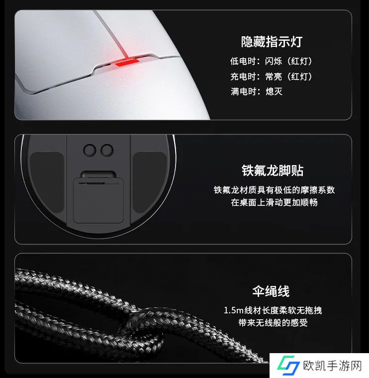 黑爵 AJ159 NL 系列鼠标提供 400 / 800mAh 两种电池可选,除 79 元款为 400mAh 电池外,其余版本皆为 800mAh。鼠标底部设有特氟龙脚贴,具备低摩擦特性;同时配置1.5m 伞绳线,适配有线状态使用。