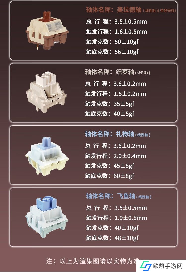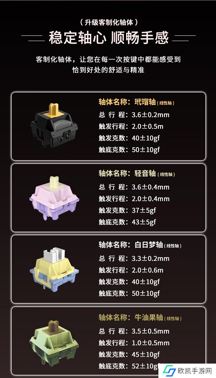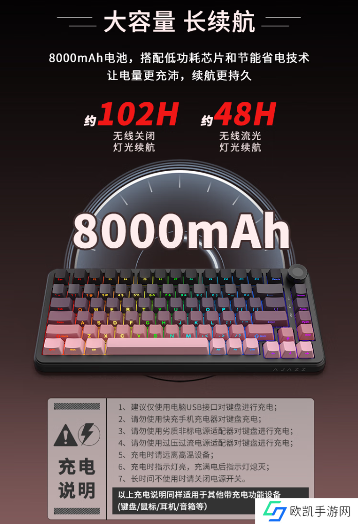 该款键盘内置 8000mAh 电池,宣称无线关闭灯光续航约 102h、无线流光灯光续航约 48h。键盘提供 FR4 / PC 两种定位板选择,升级客制化轴体。