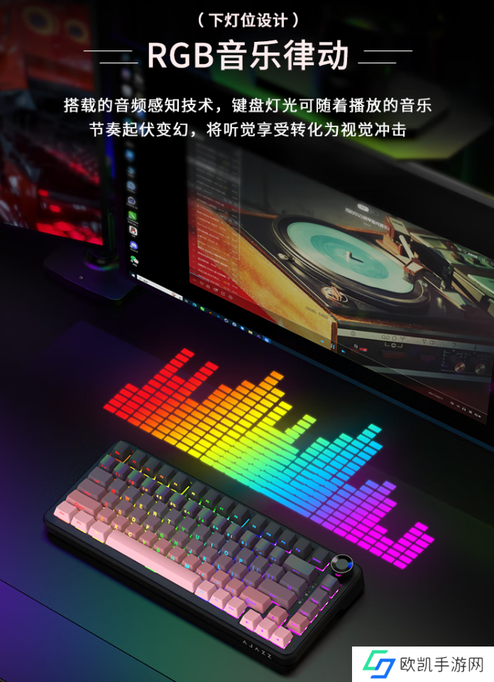 该款键盘还配备双段调节脚撑,支持输入角度调节;采用下灯位设计,支持 RGB 音乐律动。