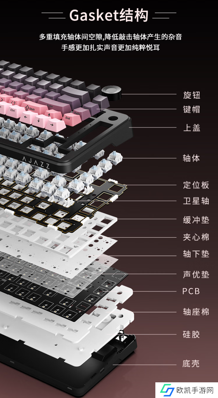 黑爵 AK820 MAX Plus 三模机械键盘采用 Gasket 结构,使用 PCB 单键开槽,支持全键轴座热插拔。键盘还配备侧面功能键,支持 2.4G / USB / 蓝牙三模切换。