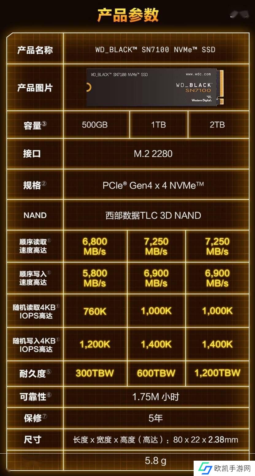 西部数据表示 WD_BLACK SN7100 面向主流游戏玩家。该 SSD 采用了 DRAMless HMB 方案,搭载 3D TLC NAND 闪存,能满足容量日渐增长的现代游戏的存储需求,同时较上一代产品 SN770 能效提高了 100%。