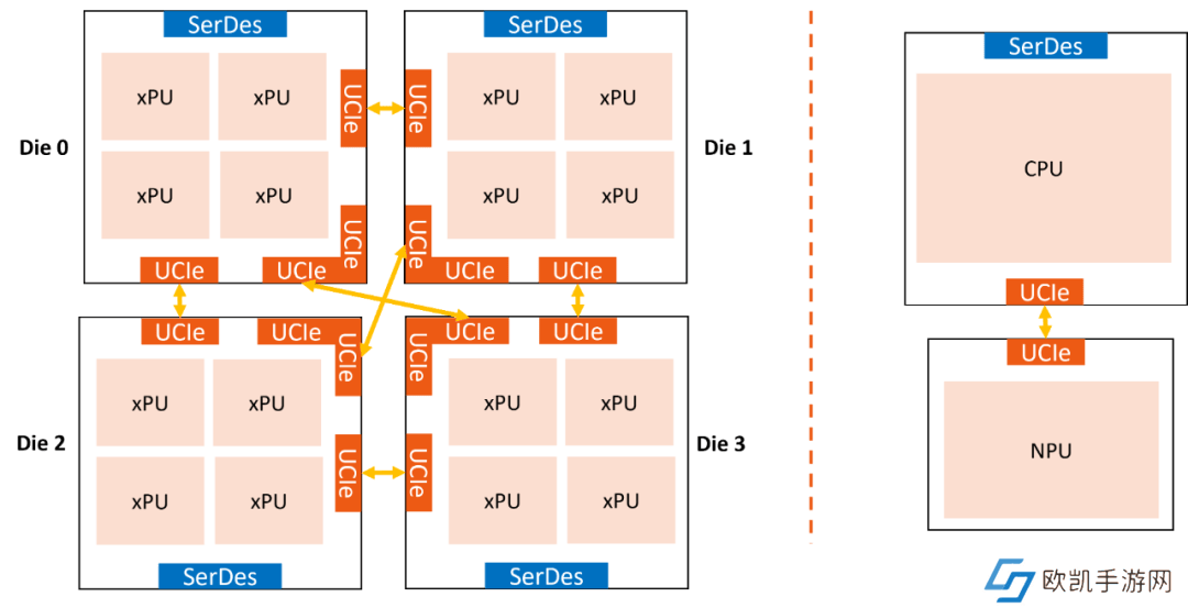 UCIe+SerDes IP的使用方式主要有2种,一种是UCIe+SerDes IP跟xPU集成在同一个Die里,Die和Die之间采用同构或者异构的集成方式。