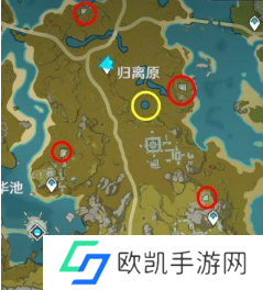 四处遗迹分别在归离原四角红圈的地方,圆盘打开之后去和NPC对话,然后去中央黄色水圈处对战遗迹守卫,开三个箱子。