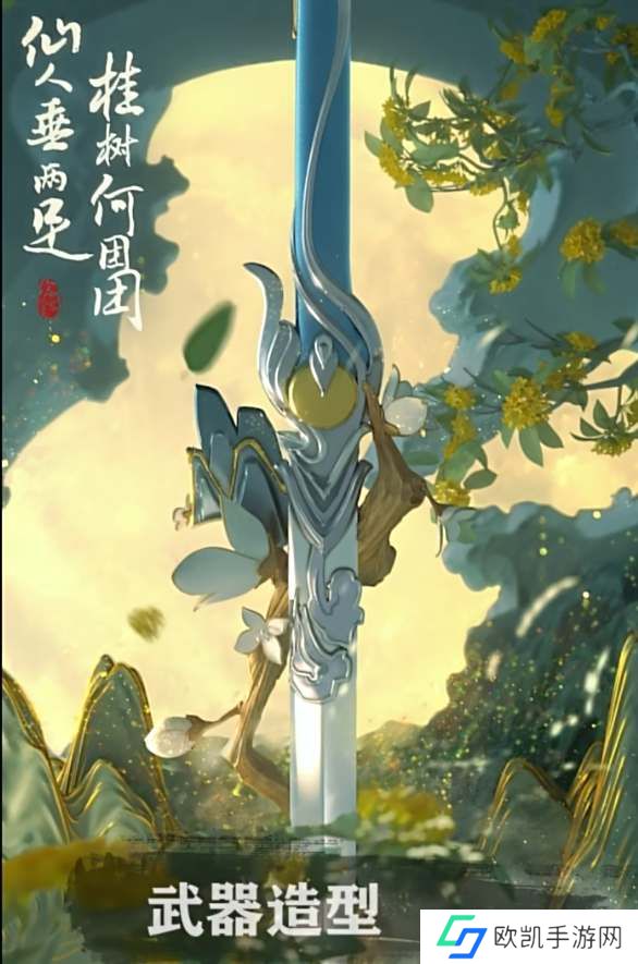 2、皮肤的武器造型上也进行了一些设计,青色剑柄搭配云纹,采用了月亮和桂树的元素,整体细节还是比较多的。