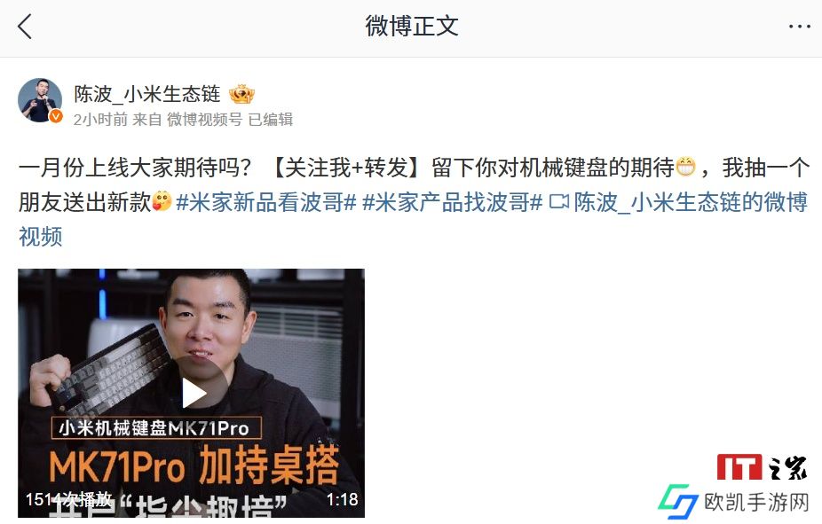 本站 12 月 15 日消息,小米生态链总经理陈波今日发布视频介绍了小米 MK71 Pro 机械键盘更多细节。该款键盘 Gasket 结构 + 71 键布局设计,支持 1000Hz 回报率,明年 1 月上线。