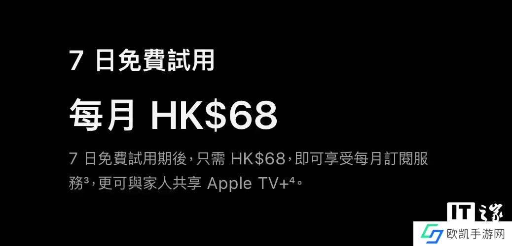 作为参考,苹果 Apple TV+ 在美国区定价为每月 9.99 美元(本站备注:当前约 73 元人民币),在香港区的定价为每月68 港币(当前约 64 元人民币),支持最多六名家庭成员共享服务。