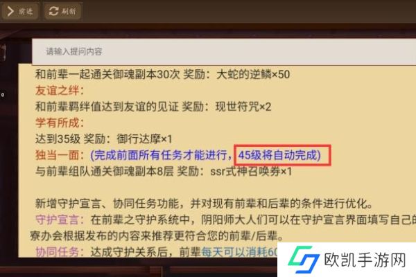 阴阳师当玩家达到45级并选择强制出师时,是会给奖励的,这些奖励包括之前任务的完成奖励和独当一面的SSR式神奖励,即使没有完成之前的师徒任务,也会根据已完成的任务数量来发放对应的奖励。