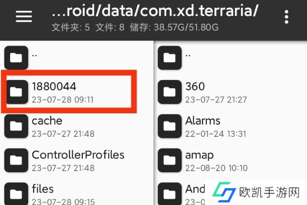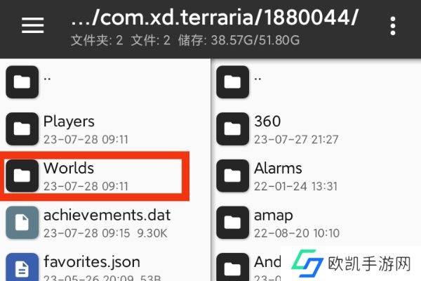 4、打开mt管理器(点击软件名下载)选择Android然后选data,再然后找到泰拉的存档文件(注意不是全物品),选择1880044,再选择Worlds。