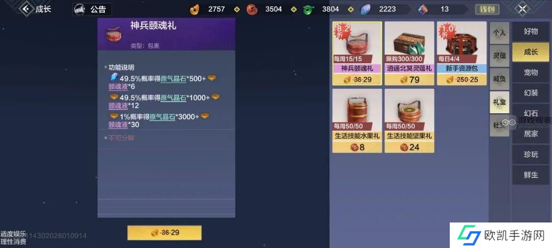 在【商店-成长-礼盒】处可购买神兵颐魂礼,开启可获得原气晶石和颐魂液。