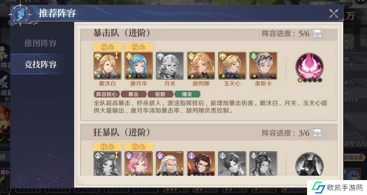 这个阵容的特点是暴击率高,通过激活指挥技可以提升暴击伤害,唐月华也有暴击加成效果,通过增益叠加让输出位打出伤害,胡列娜可以提供一些控制的效果。