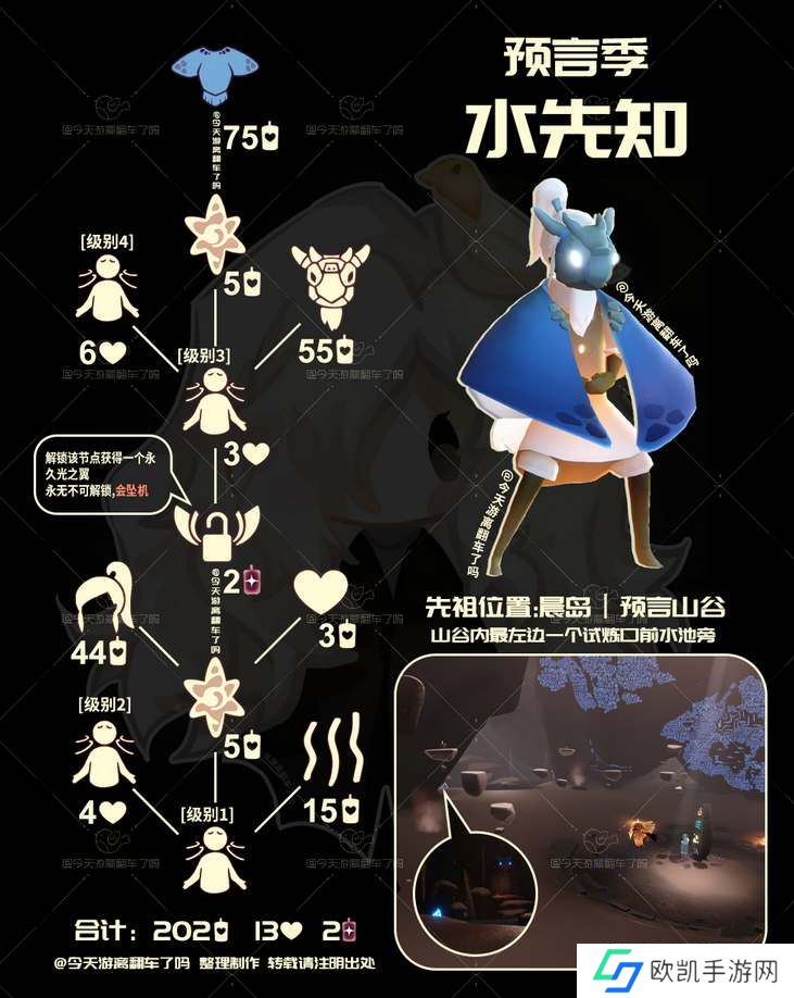 光遇预言季的水先知先祖即将在9月19日限时复刻,这个先祖位于晨岛预言山谷的最深处,追忆后就可以与其兑换物品了。兑换道具包含高马尾发型、深呼吸动作、蓝色斗篷和面具。下面为大家分享先祖的具体位置以及兑换物品价格,想要兑换的玩家可以提前准备一些蜡烛了。