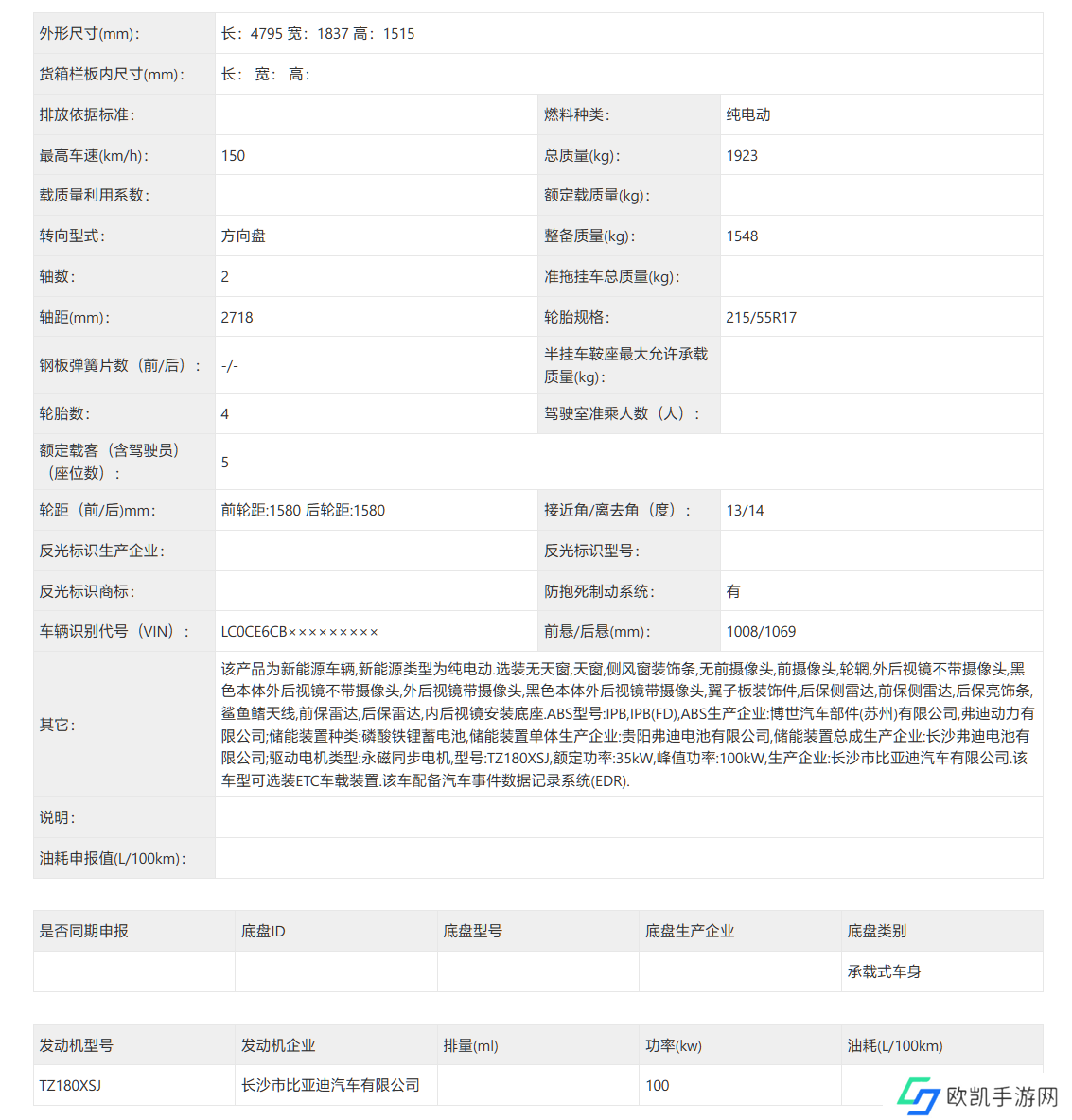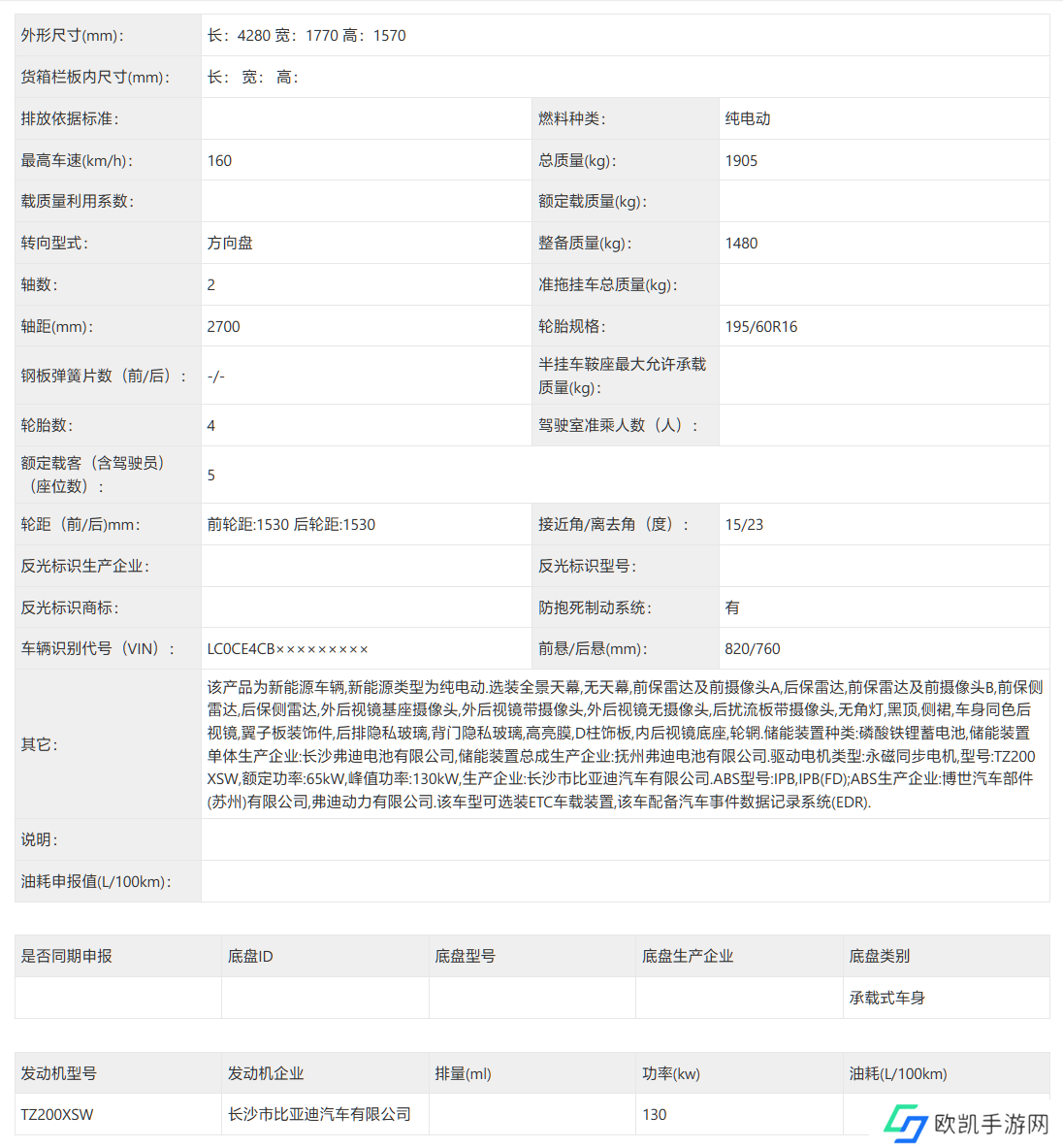 该车长宽高分别为 4280/1770/1570mm,轴距为 2700mm,搭载型号为 TZ200XSW 的驱动电机,最大功率为 130kW。续航参考现款车型提供 302km、401km、420km、520km。