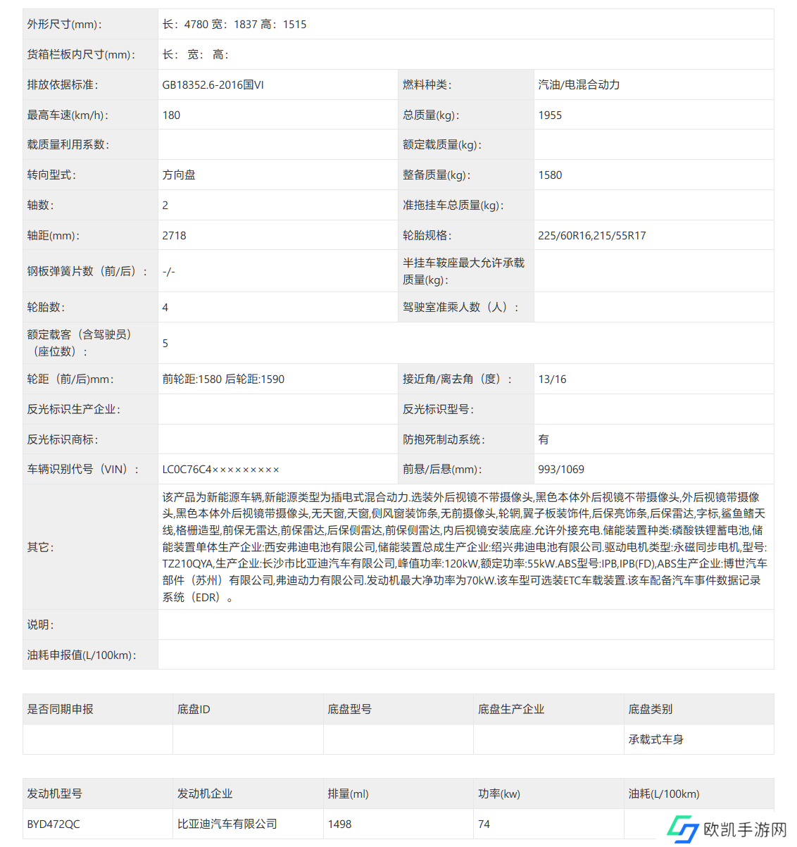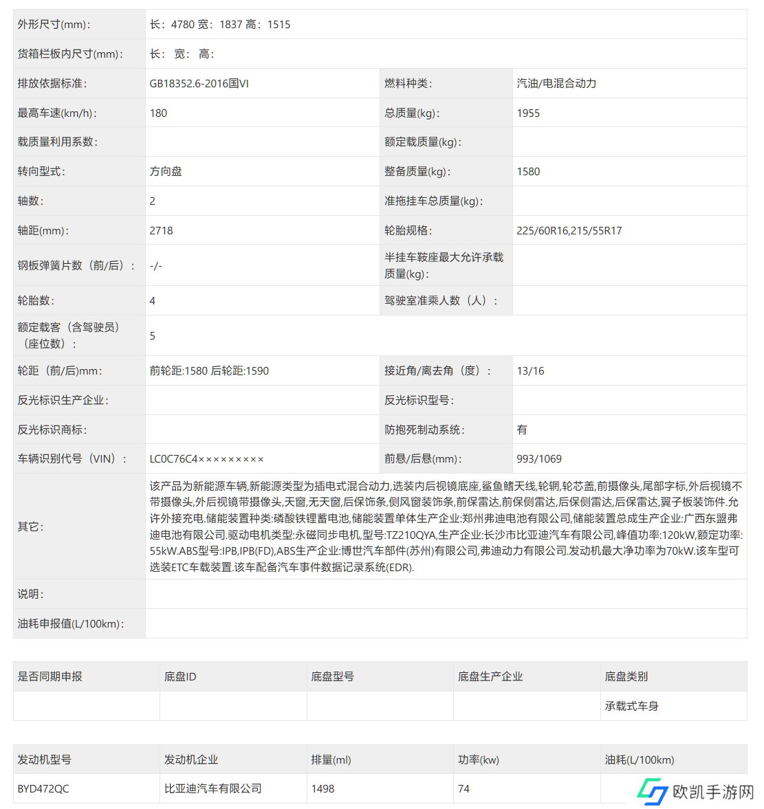 新车采用全新样式的车头、车尾,长宽高分别为 4780/1837/1515mm,比现款加长 15mm、高度增高 20mm,轴距保持 2718mm 不变。新车搭载 1.5L 发动机(代号 BYD472QC),其最大功率为 74kW(现款为 81kW),电机最大功率为 120kW(现款为 132kW)。