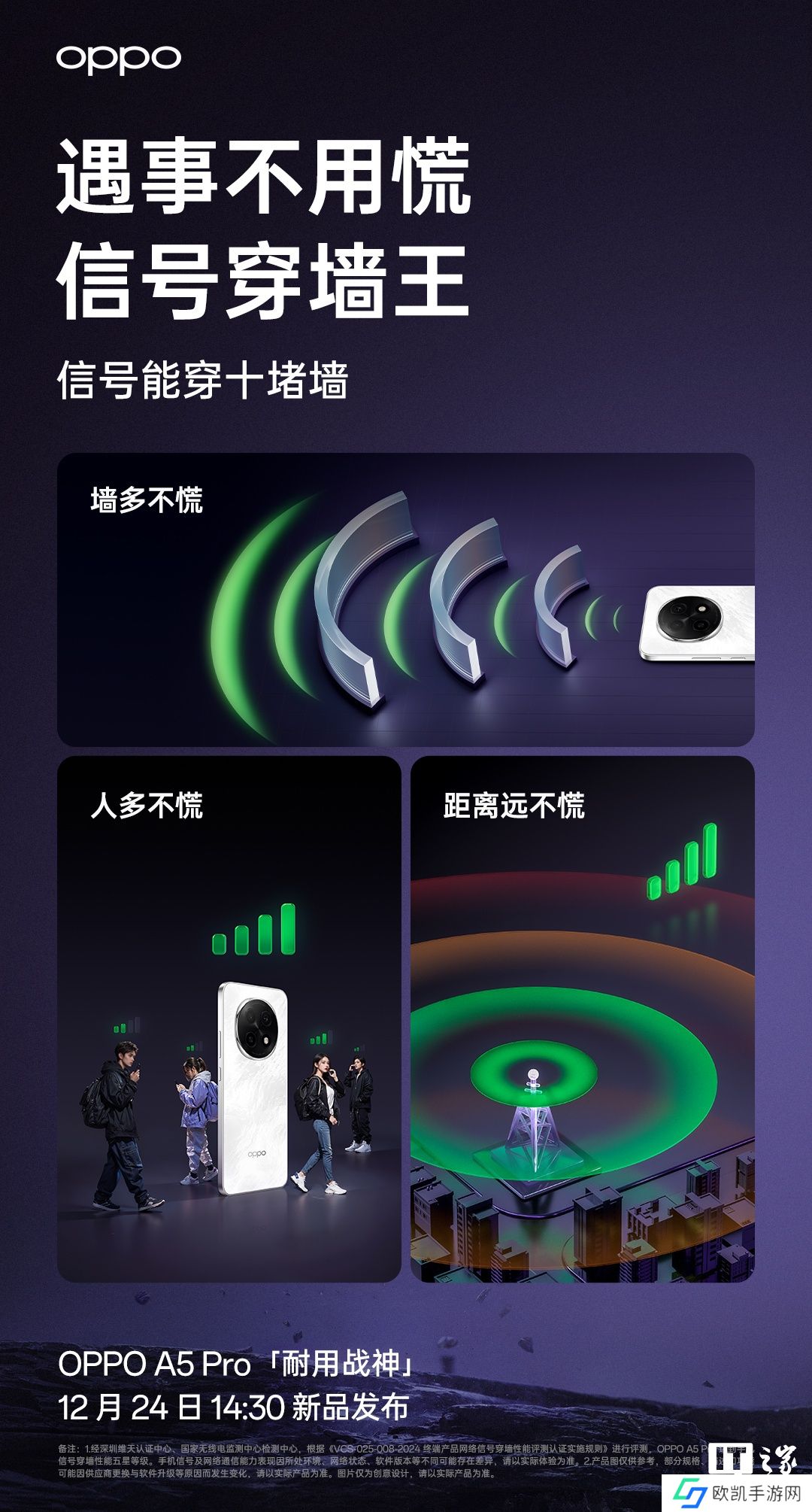 官方宣称,OPPO A5 Pro“遇事不用慌,信号穿墙王”:不怕墙厚、不怕人多、不怕距离远。