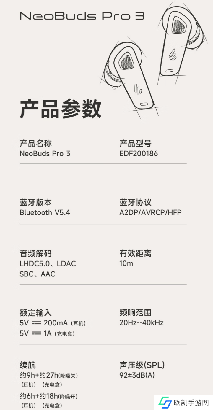 本站附漫步者 NeoBuds Pro 3 无线耳机产品参数如下: