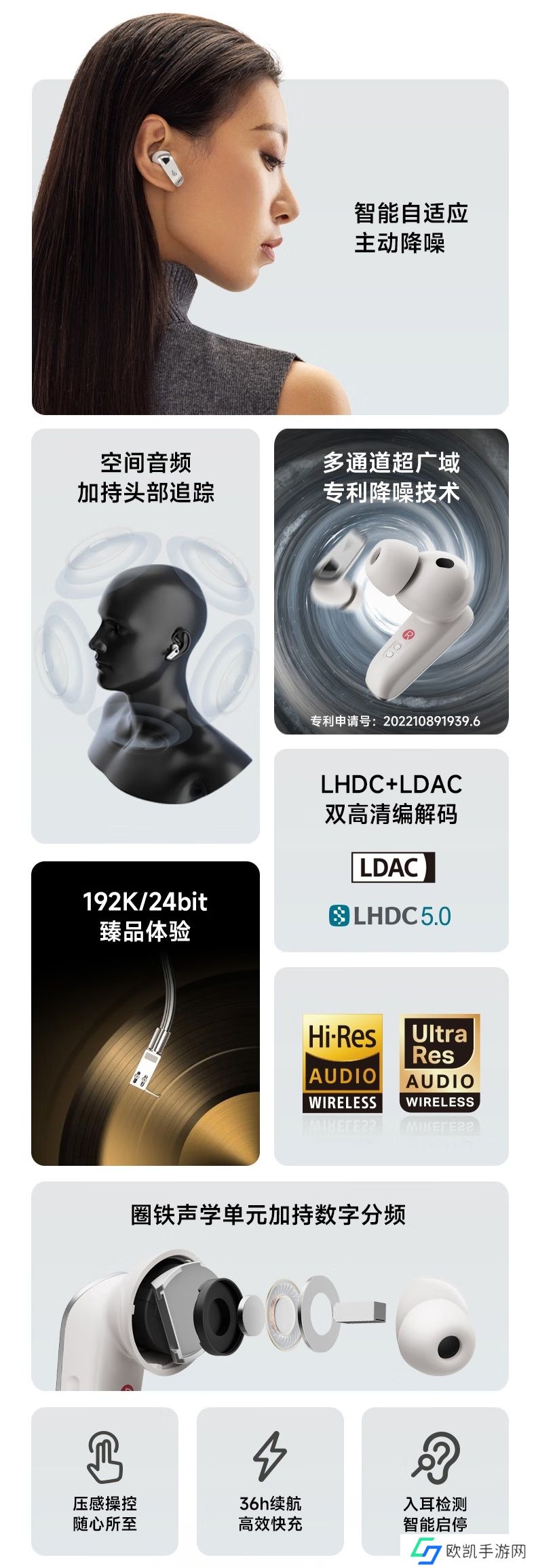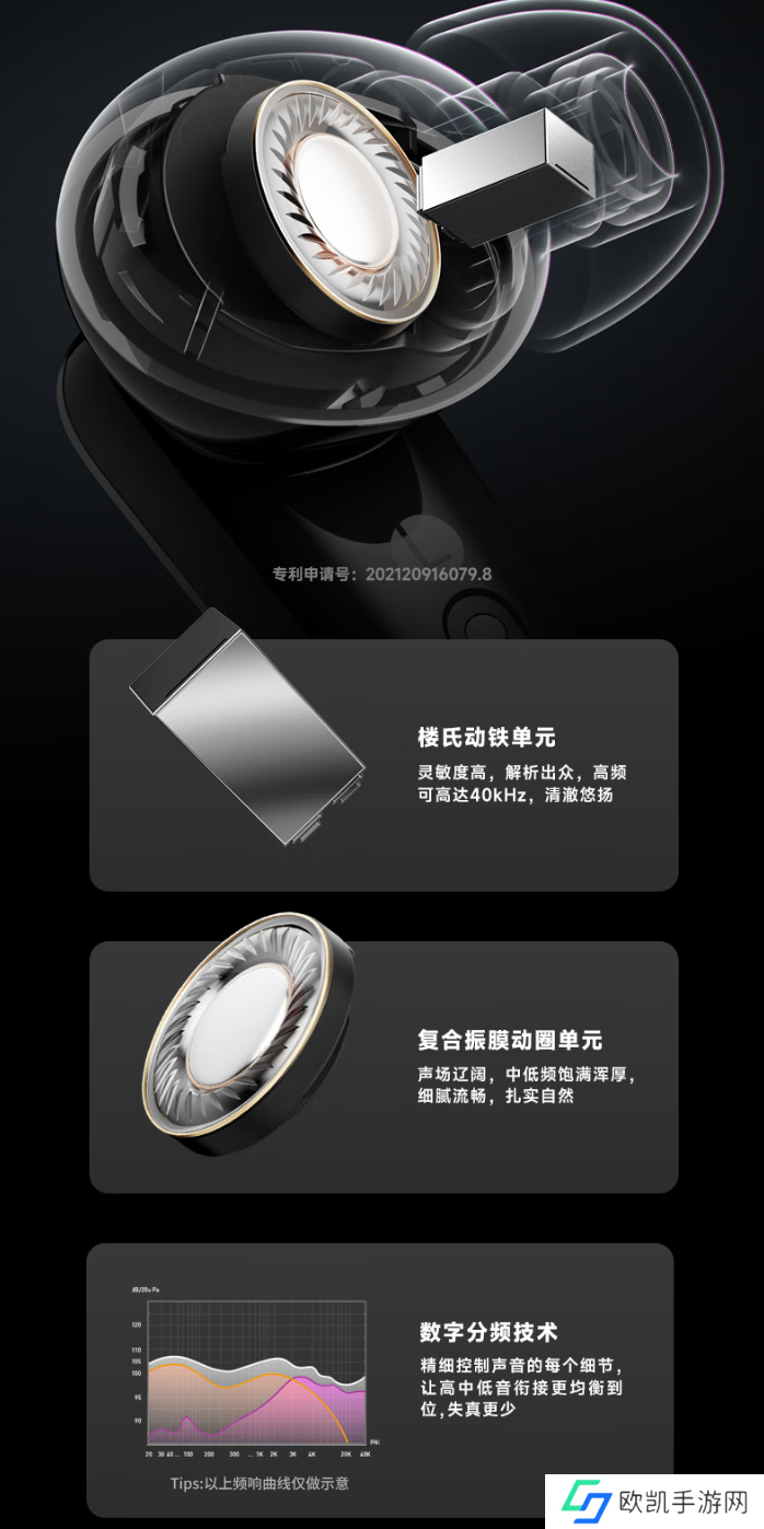 该款耳机采用“数字分频 + 圈铁单元”技术,配备楼氏动铁单元 + 复合振膜动圈单元,宣称高频可达 40kHz。耳机支持自适应降噪,深度 -50dB、宽频 4kHz。