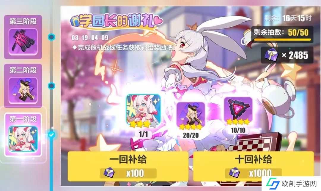 「学园长的谢礼」补给活动共有四个阶段,第四阶段为隐藏阶段,将在前三阶段兑换完后出现。每个阶段都可以兑换补给50次,可获得3★圣痕「德丽莎·生日(下)」、「女武神·荣光」碎片、逆熵·虚数核心等奖励。