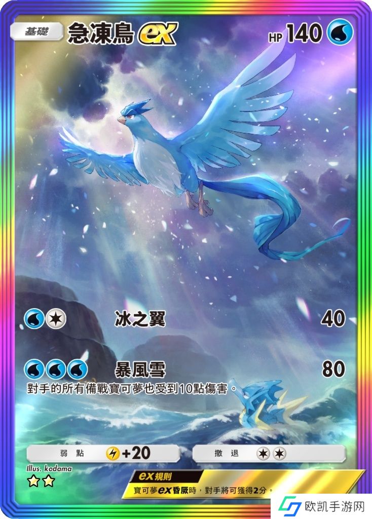 卡牌中描绘了传说的宝可梦急冻鸟在雪花飞舞的海上飞翔的样子,真让人忍不住想把这张卡牌和宝可梦在空中飞翔的卡牌摆在一起欣赏呢。