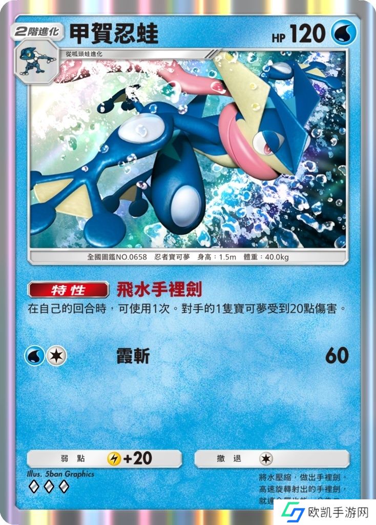 卡牌中的甲贺忍蛙在水中威风前进的样子,实在令人着迷。这张插画在2013年于《宝可梦集换式卡牌游戏》中公开,卡牌的特性及招式则和当时有所不同。玩家可以与被描绘得栩栩如生的宝可梦们来场令人怀念的重逢,也能够享受崭新的邂逅。
