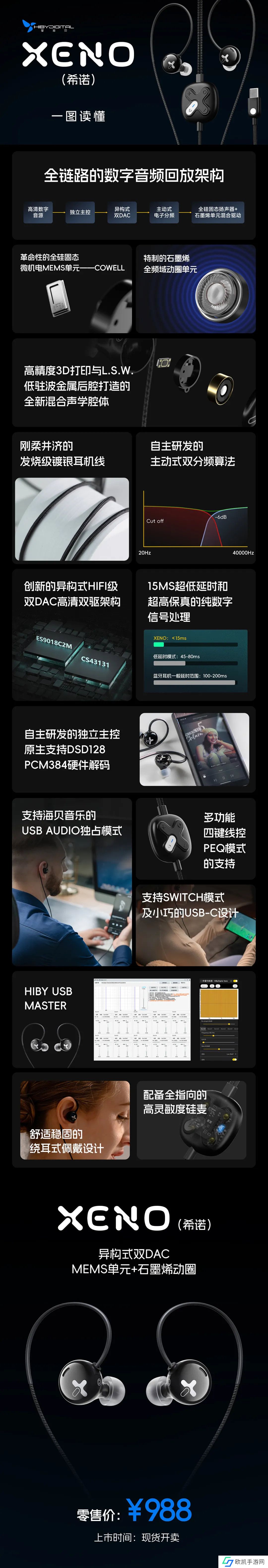 海贝 XENO(希诺)还采用异构式 HIFI 级双 DAC 高清双驱架构,支持 15ms 超低延时和高保真纯数字信号处理。该款耳机还搭载自主研发的独立主控,原生支持 DSD128、PCM384 硬件解码。耳机采用 USB-C 设计,支持海贝音乐的 USB AUDIO 独占模式、支持 SWITCH 模式。