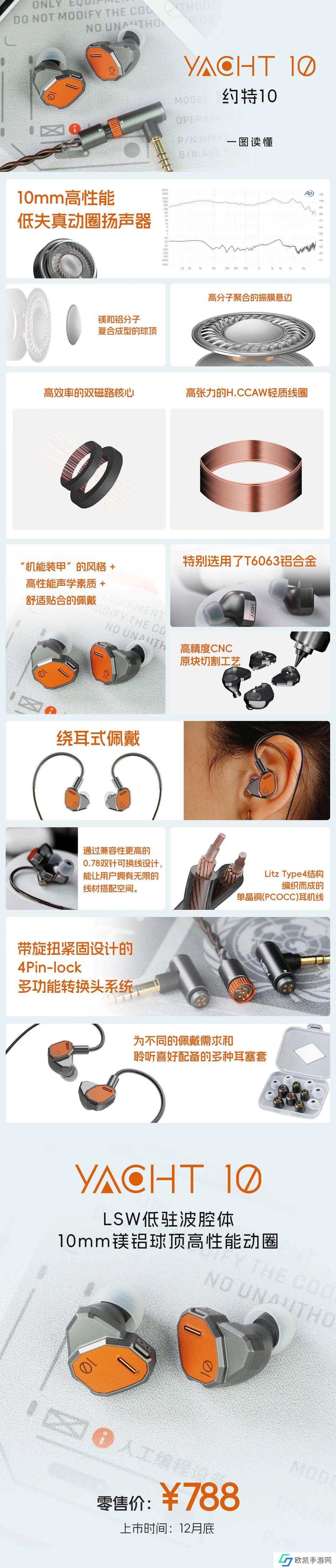 海贝约特 10 耳机配备 10mm 动圈扬声器,拥有镁和铝分子复合成型的球顶 +高分子聚合振膜悬边。耳机使用双磁路核心 +H.CCAW 轻质线圈,将于 12 月底上市。