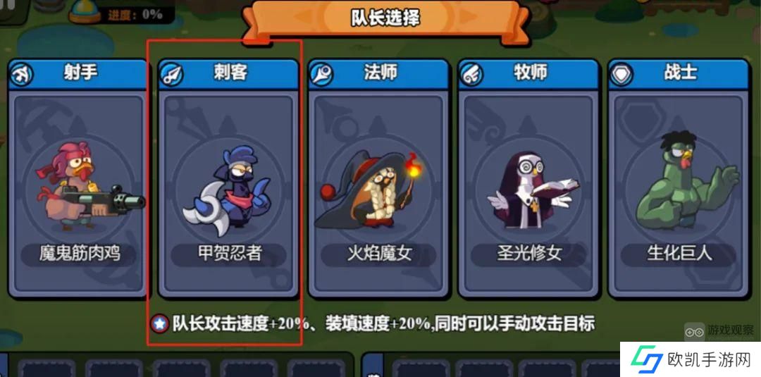 我们来看看战斗界面,首先必须选择一个主力培养的鸡当队长,我们看到队长是有非常厉害的攻速20%和换弹20%加成,同时还能手动控制弹道(很重要),接下去就是羽毛用来升级技能,蛋壳增加角色,大家可以自行摸索