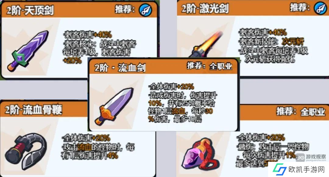 这5个技能是刺客专属的技能,其中天项剑是最核心的技能,能增加大量的伤害,而激光剑是第二重要技能,其释放的次元斩是怪潮来时的清怪技能,而流血的2个技能简直就是打BOSS的神技能,同时对清兵也有不俗的效果