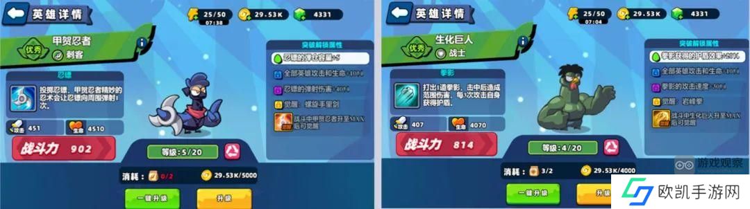 一个就是忍者、还一个就是绿巨人,忍者具有全屏的弹射,后续局内技能可以增加弹射目标,对于清理小怪是很不错的选择,而绿巨人的护盾在局内可累加4个,前期可免疫4下伤害,非常实用