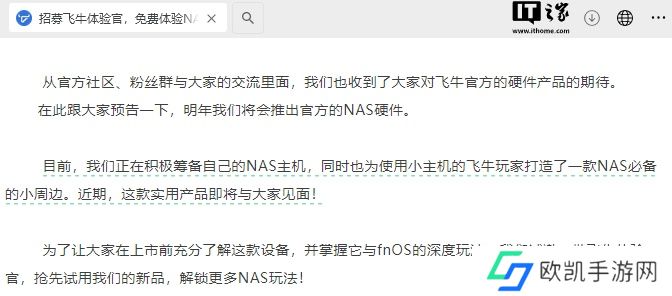 本站 12 月 12 日消息,飞牛私有云 fnOS 是一款免费的国产 NAS 系统,基于最新 Linux 内核开发,兼容 x86 硬件,用户群体较广。飞牛官方今日宣布:明年将会推出官方的 NAS 硬件。