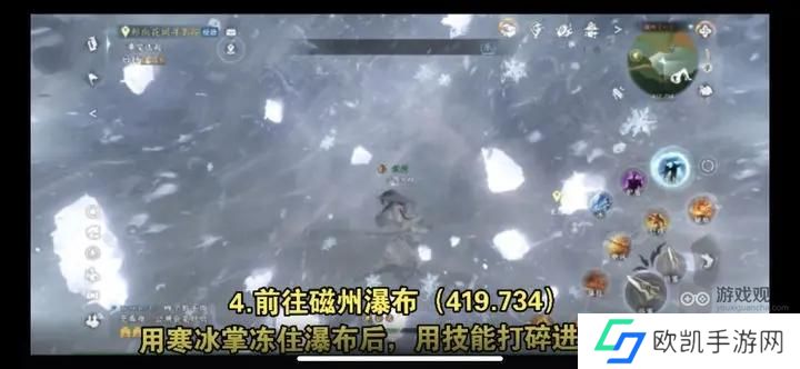4、前往磁州瀑布(419、734),用寒冰掌冻住瀑布后,用技能打碎进入山洞,发现被草缠绕的宝箱,使用烈火燎原烧掉杂草,开箱后获得线索五