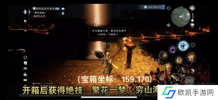 7、再次进入瀑布后山洞(磁州419、734)一直往里走,先击败石门外刀狂,再用穷山海武器打开石门(单挑不过可以组队打刀狂),山洞最深处有个大宝箱,开启后会进入暗洞,使用莹火或火把照明,跟随蝴蝶指引来到宝箱处-(宝箱坐标:159、170)
