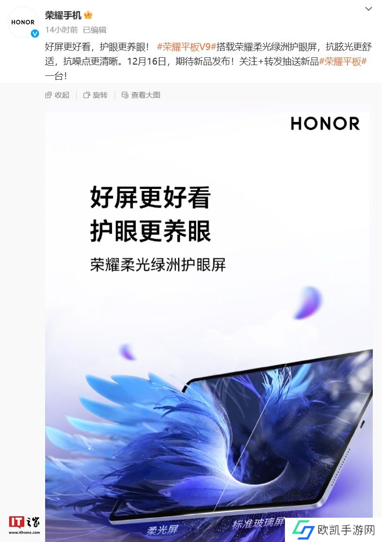 据荣耀官方最新预热,荣耀平板 V9 将搭载“荣耀柔光绿洲护眼屏”,宣称其具备抗眩光、抗噪点的特性。