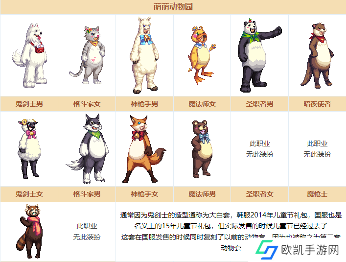 萌萌动物装扮通常因为鬼剑士的造型通称为大白套,是韩服2014年的儿童节礼包,国服也是名义上的15年儿童节礼包,但实际发售的时候儿童节已经过去了,这套在国服发售的时候同时复刻了以前的动物套,因为也被称之为第二套动物套。
