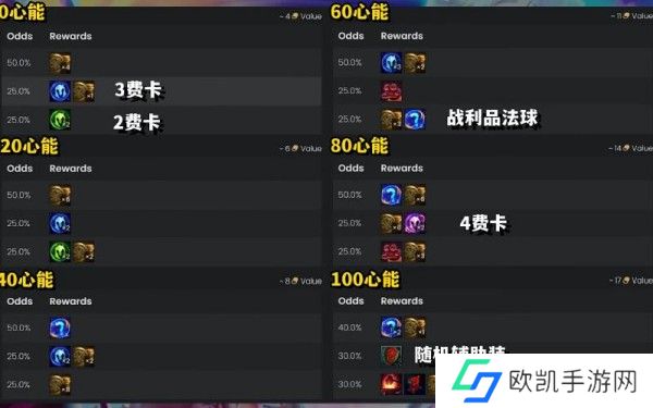 1、0-100心能:随机2、3费卡、随机散件、随机辅助装或一些金币;