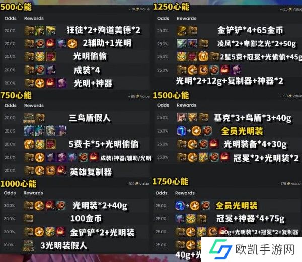3、500-1750心能:随机成装、随机辅助装、光明装备、全员光明装、冠冕、大妮蔻、5费卡或奥恩神器;
