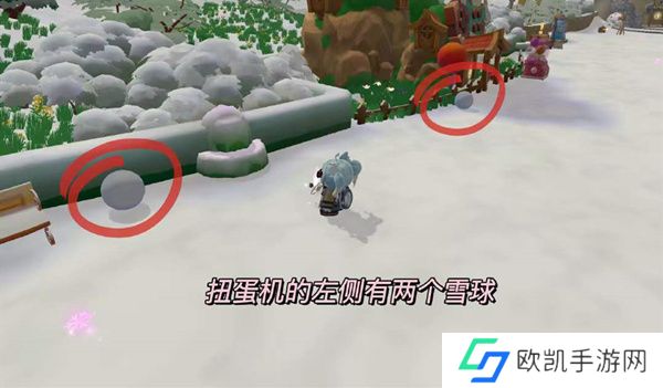 4、接着往左边走,在扭蛋机的左侧有两个雪球。