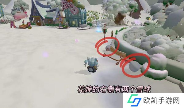 3、继续往右边走,在花婶的右侧有两个雪球。