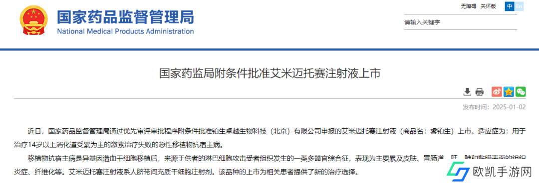 本站 1 月 2 日消息,据央视新闻报道,今天(2 日),国家药监局通过优先审评审批程序附条件批准我国首款干细胞治疗药品艾米迈托赛注射液上市。这是一种罕见病用药,用于治疗 14 岁以上因血液系统疾病进行造血干细胞移植后出现的并发症。
