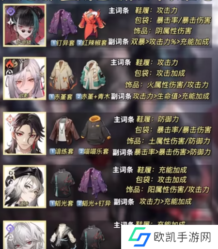攻击加成(足部)、暴击率/暴击伤害(手部)、阴属性伤害加成(饰品)