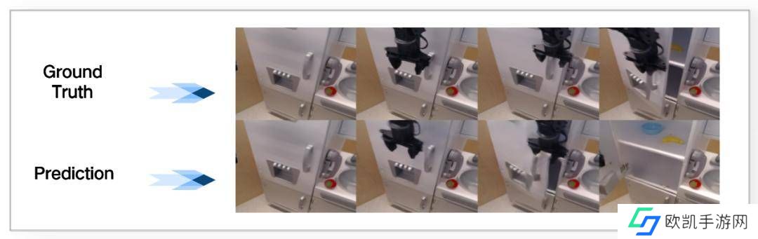 例如,下图中上方的图片展示了真实物理世界中打开冰箱的逐帧操作,下方的图片则为ERA-42生成的环境建模与对打开冰箱任务的逐帧预测。可以看到两张图片非常接近,说明模型预测非常准确。这与其他机器人大模型直接学习行动、而忽视对世界本身理解的方式,或者仅将世界模型用于生成仿真数据的方式,存在本质的区别。
