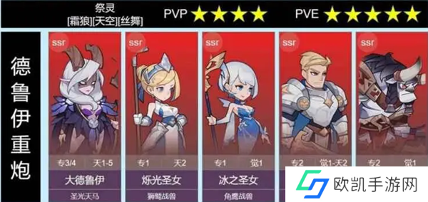 阵容解析:主养德鲁伊,主动用觉醒变身,月火超高伤害点杀,前排圣骑和牛,确保坦度,冰女可以酌情更换为增益辅助,月神或女王,圣女保一手免控,也可直接替换另一个副C或控制,毕竟枭兽就算免控受击还是会被打断。