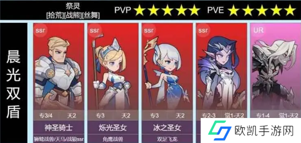 阵容解析:物法群盾,奶量充足,适合站桩不会脱离圣女和圣骑士套盾范围的主C。主养邪狩,副圣骑与圣女月神提供入场buff,另外一个角色可选择较多,青铜、冰女、女王均可,万金油阵容,邪狩可能更换雷枪,影舞等。