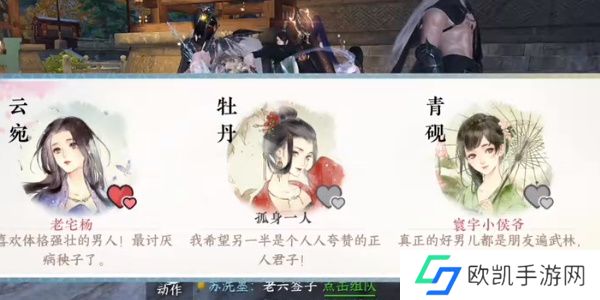 4、随后选混的不错,然后男号选云宛和牡丹,女号选沈岳和江宜,接着进行人物对话;