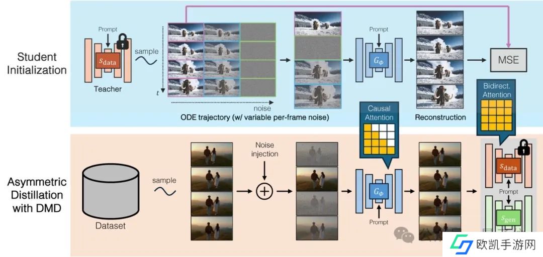 引入一个拥有未来信息的双向教师模型,在蒸馏训练阶段指导自回归的单向学生模型。这种教师-学生结构允许模型在生成未来帧时具备更强的精确度。
