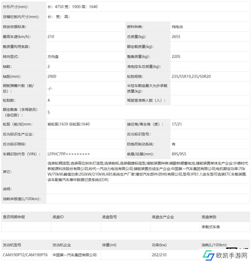 申报信息显示,这款新车长宽高分别为 4750mm / 1900mm / 1640mm,轴距为 2900mm,产品名称为“纯电动多用途乘用车”。此外,该车搭载宁德时代的磷酸铁锂蓄电池,提供 210kW 单电机以及 202kW / 210kW 双电机版本。