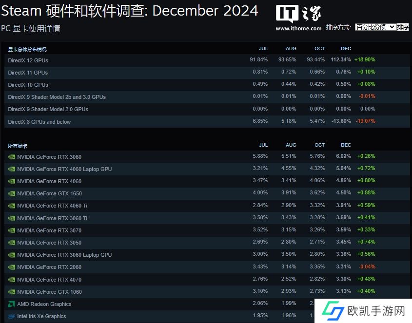 除了系统份额之外,Steam 目前份额占比最高的显卡是 RTX 3060,其次是 RTX 4060 移动版,再其次是 RTX 4060 桌面版。